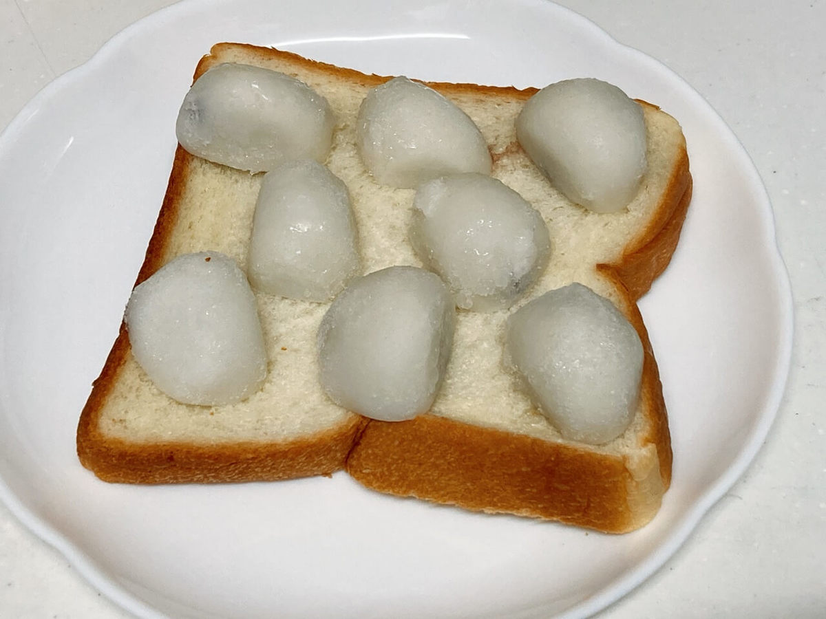 ②6枚切り食パン1枚の上に、切ったぷち大福を間を空け並べる