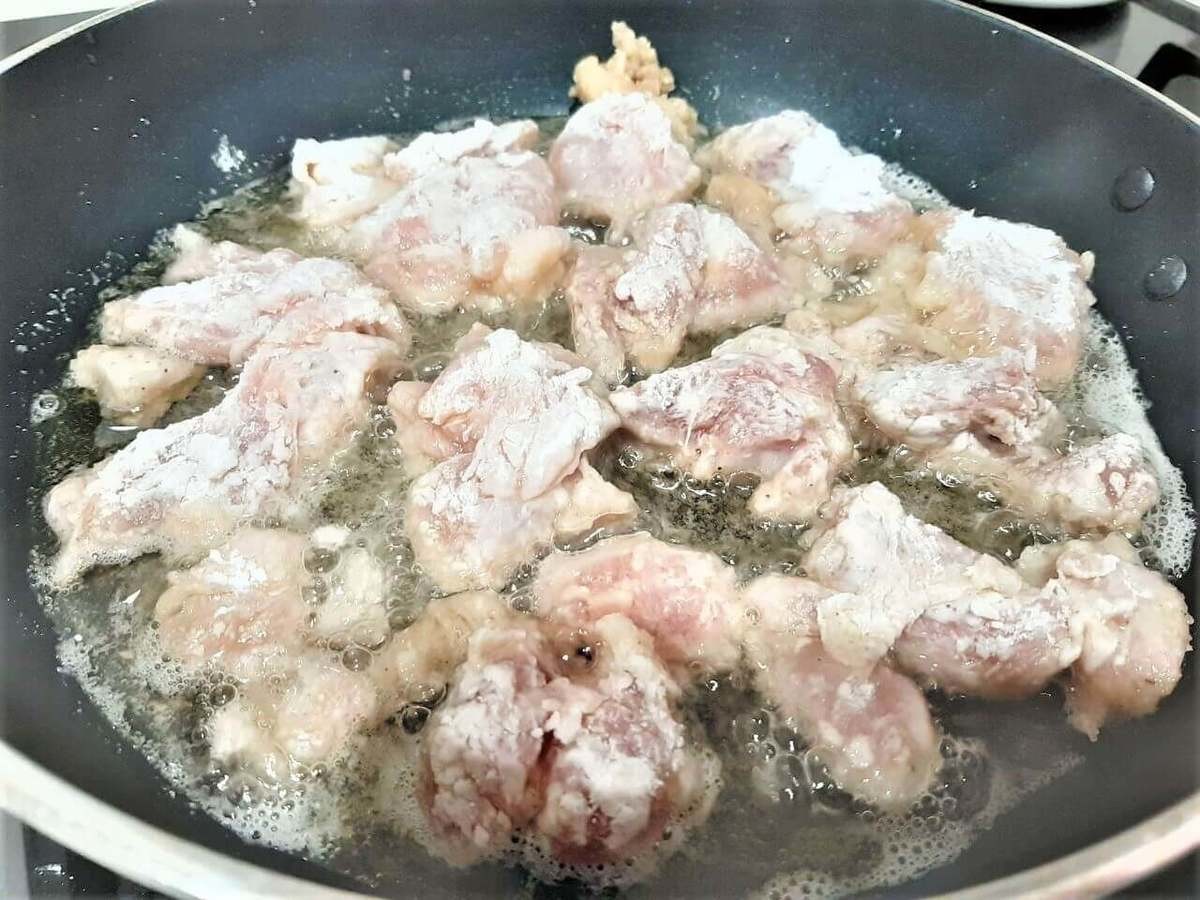 全体に片栗粉をつけたら、180℃の油で揚げていきます。