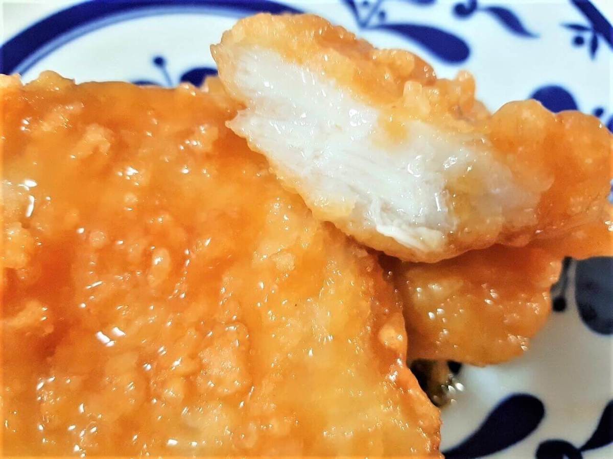 衣は厚すぎず程よくタレが染みているのですが、サクッと食感も残っています。 冷凍ものって衣が微妙に感じることが多いのですが、この商品は衣までおいしいんです。
