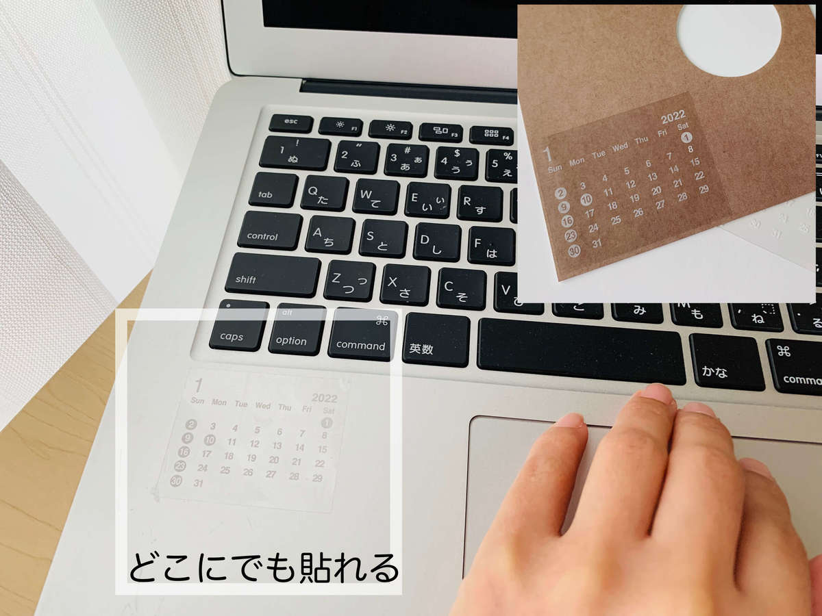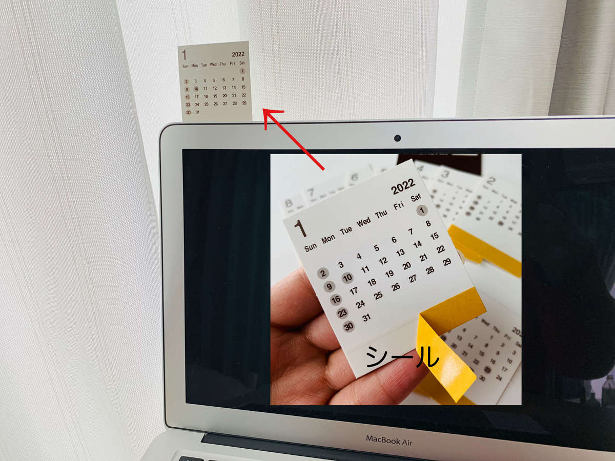 ミニカレンダー本体は、ペラペラ感もなくしっかり固めの紙質です。使う時は、黄色い用紙を剥がしノートパソコンの裏側にピタッと貼るだけ。
