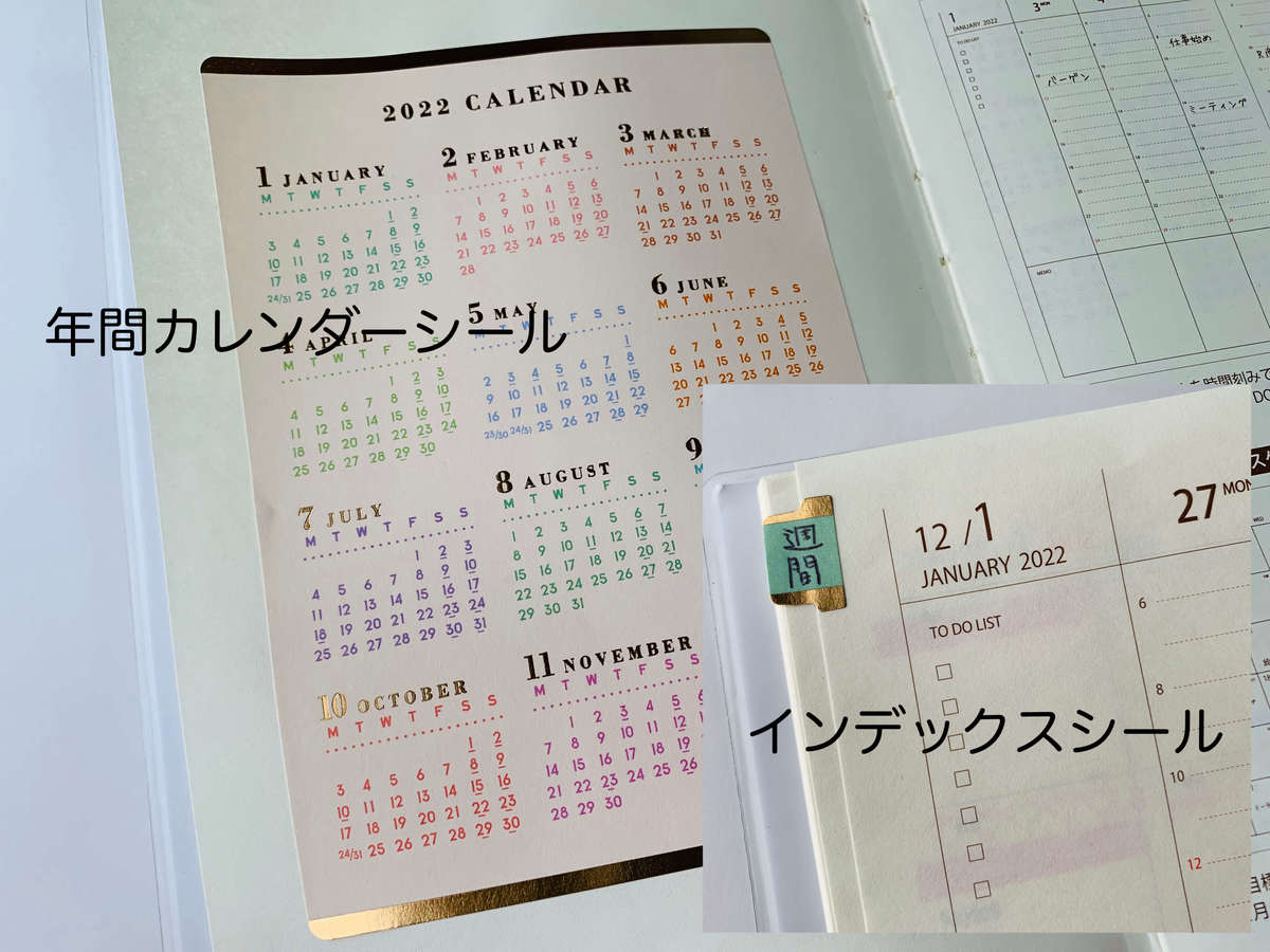 こちらは、見た目もカラフルでカレンダーやインデックスなど計4枚のシールがセットになっている“シートシールカレンダー(110円 税込)”。