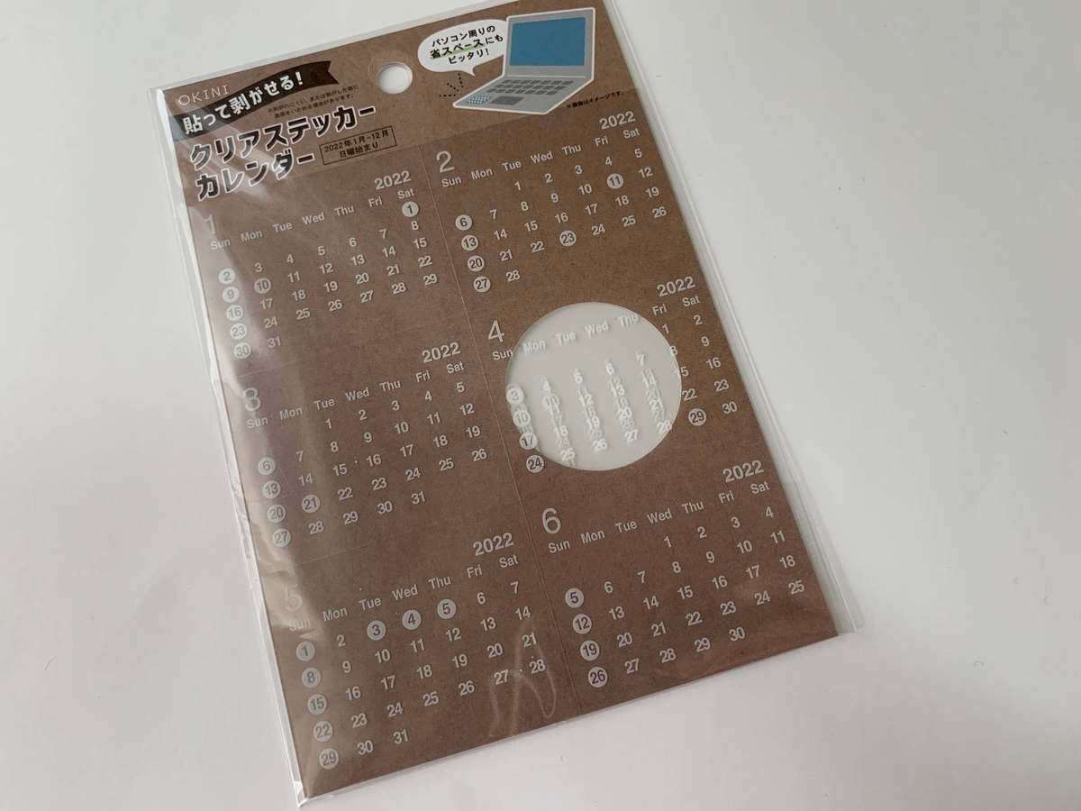 こちらは、透明なシールにホワイト文字で印刷されている“クリアステッカーカレンダー(110円 税込)”。貼って剥がせるタイプで、裏側がすべてシールになっています。