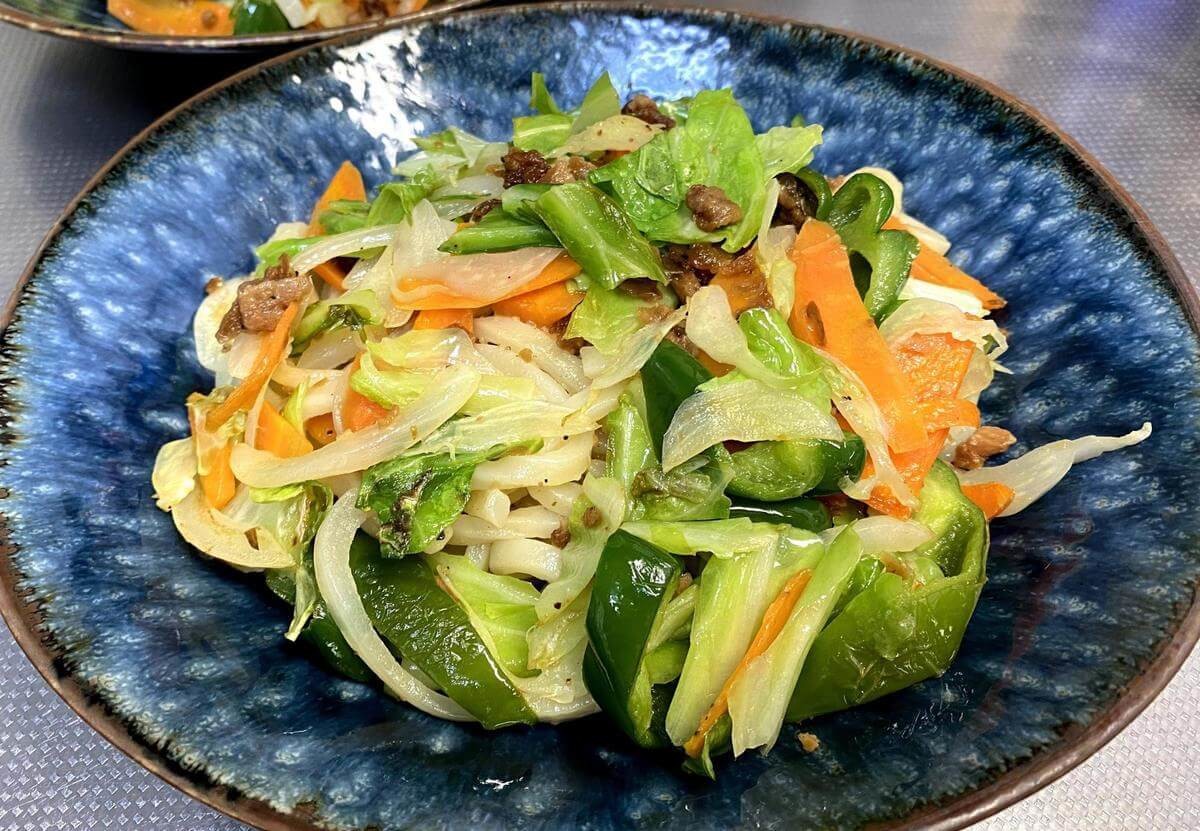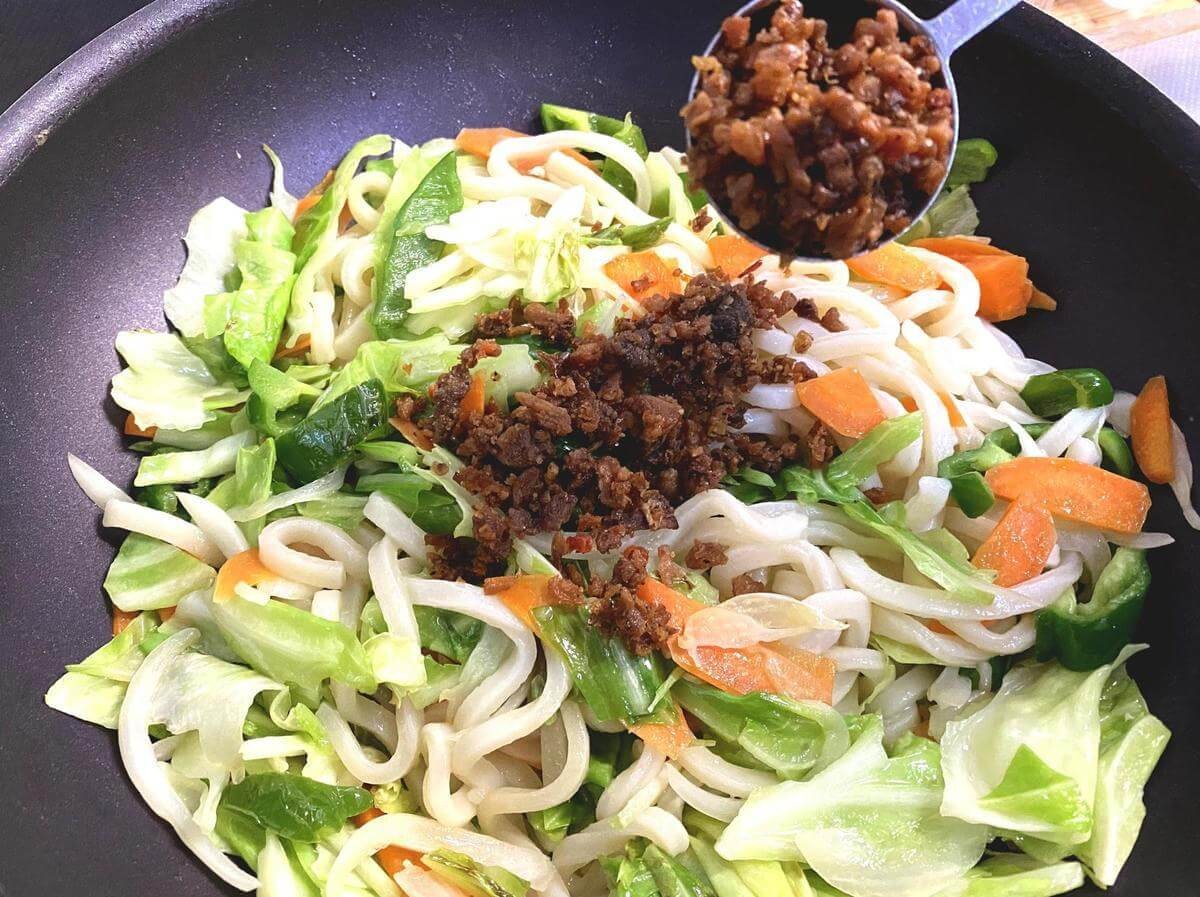 人参、キャベツ、ピーマンなどの家にある野菜とうどんを炒め、そこにチャーハンの素を入れます。今回は一人あたり大さじ1入れましたが、味を見てお好みで足してみてください。