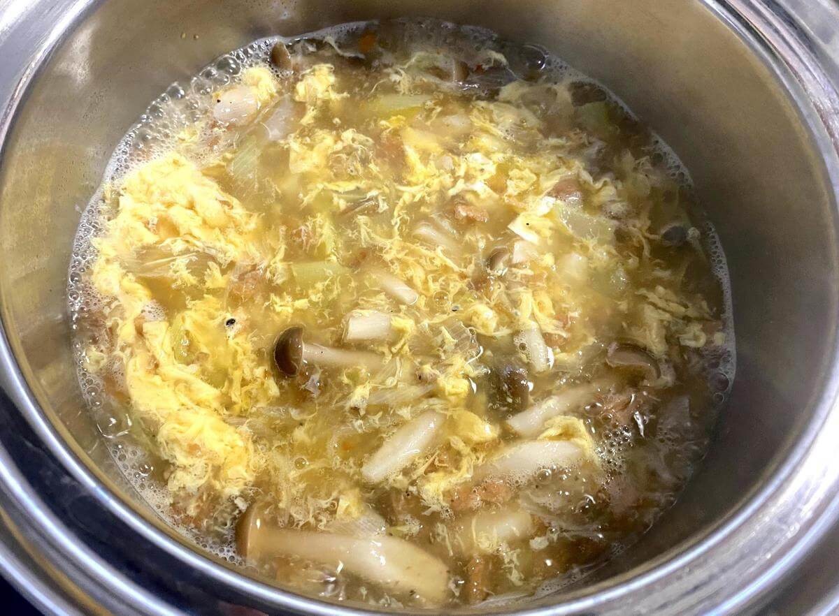 しょうが、しめじ、ネギのスープの中にチャーハンの素を人数×大さじ1杯入れます。最後に卵をといて完成です。