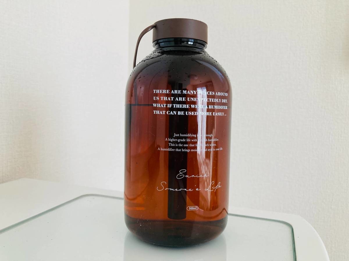 ボトルの外側には、「MAX」と書かれた満水線があります。線まで入れると約500mlの水が入ります。ただしアロマオイルには対応していません。故障の原因になるため、水だけで使用してくださいね。