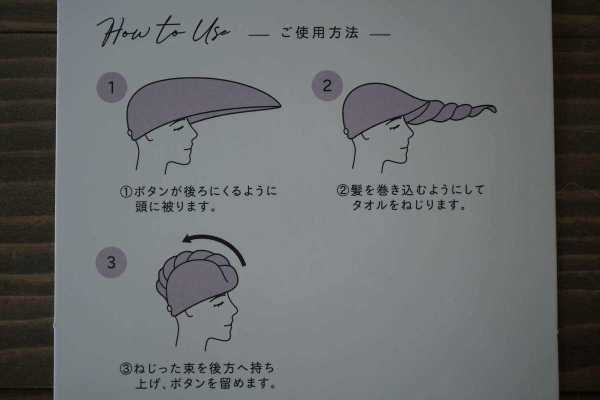 タオルはボタンなどがついていないので、タオルキャップのようにしっかり頭に巻くことができませんでした。 吸水性はよいのですが、使い勝手はタオルキャップの方がよいかなと思います。