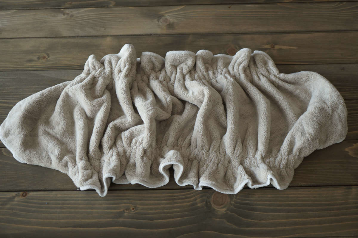 こちらは繊維が細く、ふんわりとした柔らかさが特徴の「サンゴマイヤー」が使用されたヘアドライタオルキャプです。