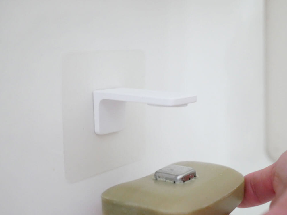 ですが「フィルムフックマグネット石鹸ホルダー」で石鹸を浮かせておけば、そんな感触や手間も省け、乾燥が早いのでいつでも気持ちよく使い続けられます。