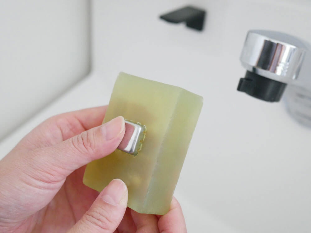 石鹸の取り付け方は、ギザギザのステンレス板を埋め込み、本体のマグネット部分にくっつければ完了。