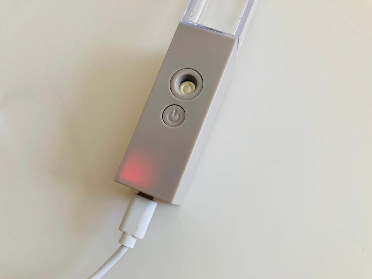 充電が始まると、本体のLEDが赤く点灯します。充電時間はおよそ45分。充電が完了するとLEDが消灯します。