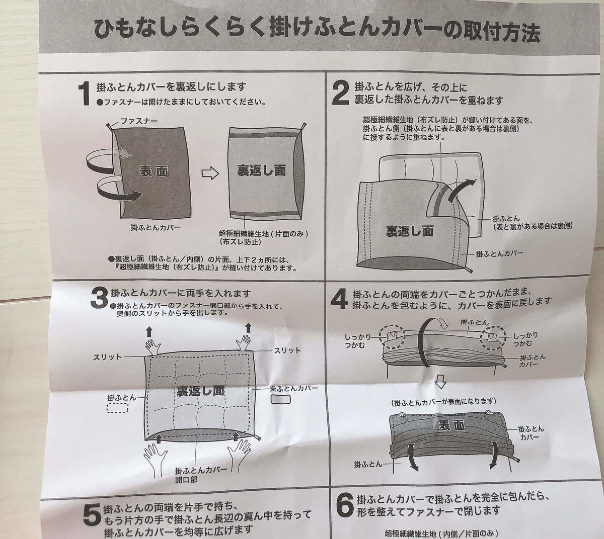掛け布団カバーの掛けかたの説明書が入っていました。