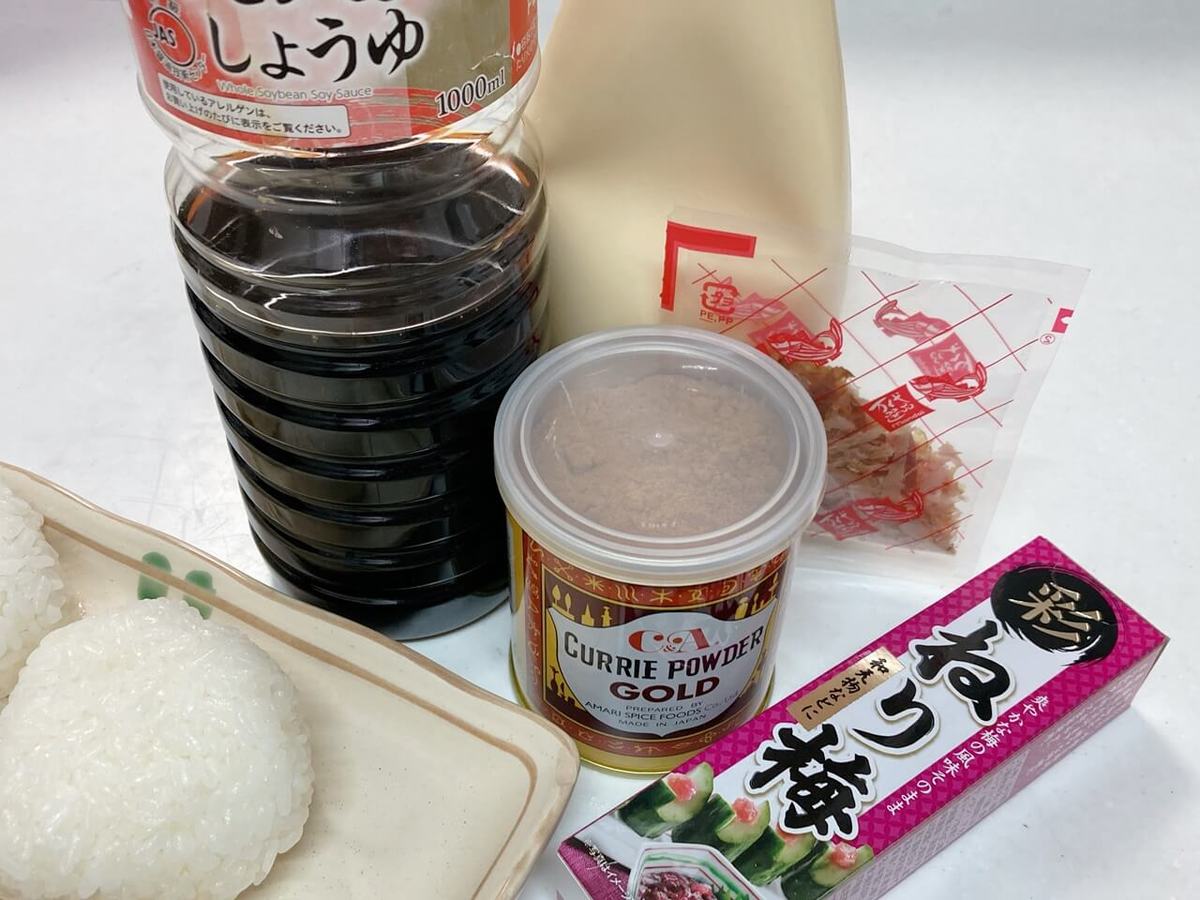 ②カレー粉(大さじ1)しょう油(小さじ2)マヨネーズ(大さじ2)かつお節(2.5g)梅干し(少々)を順に混ぜ合わせ、おにぎりにまんべんなく塗る