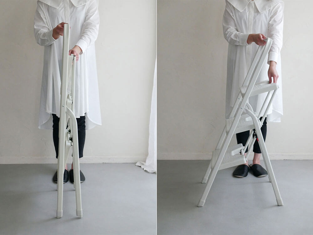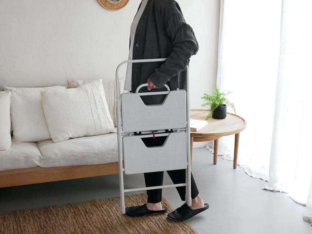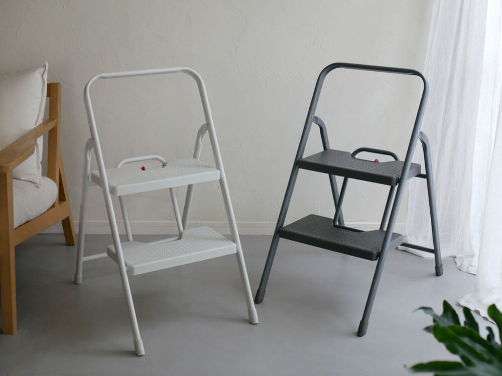 室内に馴染むようマットな質感とニュアンスカラーが推し。 手軽に運びやすく、足元は安全に、ご家族みんな納得できる脚立です。
