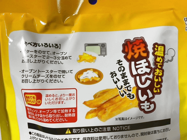 ほしいもはストーブの上に置いて温めたり、トースターでカリッと焼いたりするのが定番?昔ながら?だと思いますが、パッケージ裏にはバターやチーズをのせるアレンジレシピも紹介されていました。