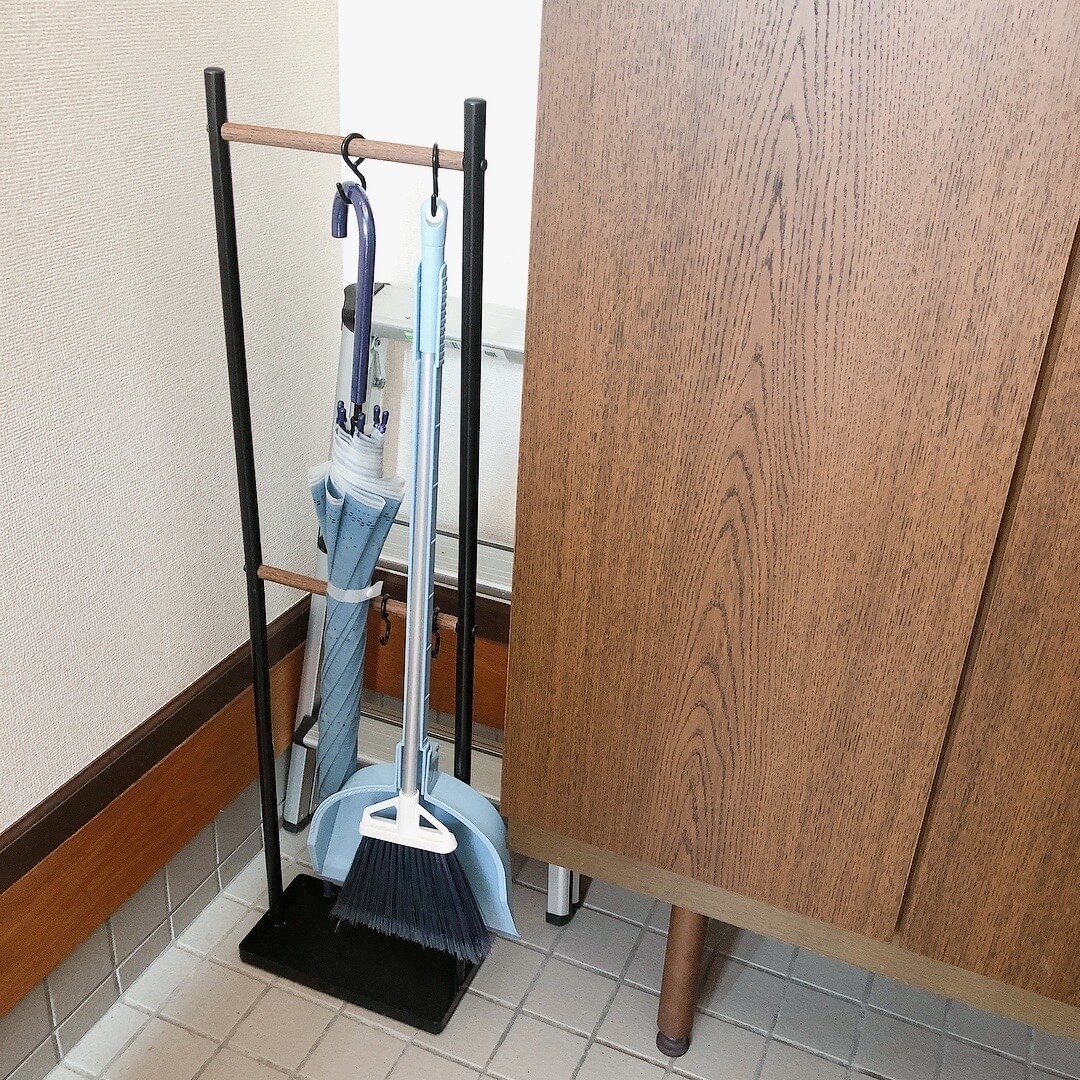 フックに引っ掛けられる穴があるので、私はニトリで買った傘ハンガーに引っ掛けて収納しています。