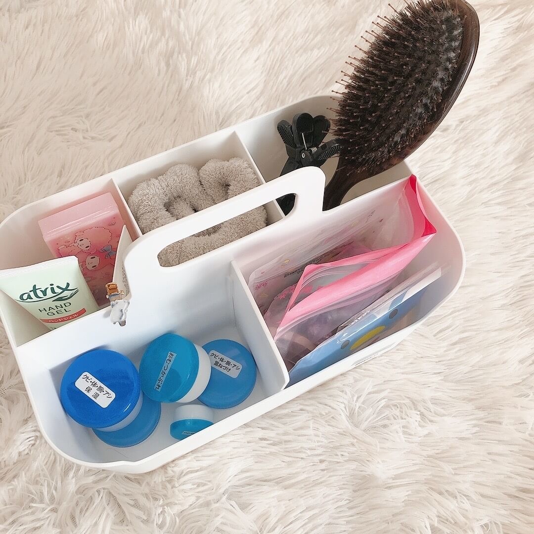 娘の塗り薬、ヘアゴム、ヘアブラシなどバラバラに収納していたものを一つにまとめることで、ものを出し入れする回数が劇的に減りました。