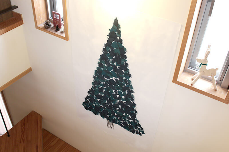 ツリーを置く場所といえばリビングや子ども部屋が一般的ですが、このタペストリーなら家のちょっとした壁スペースにおさまりがよく、階段や玄関などにも飾りやすいですよ。