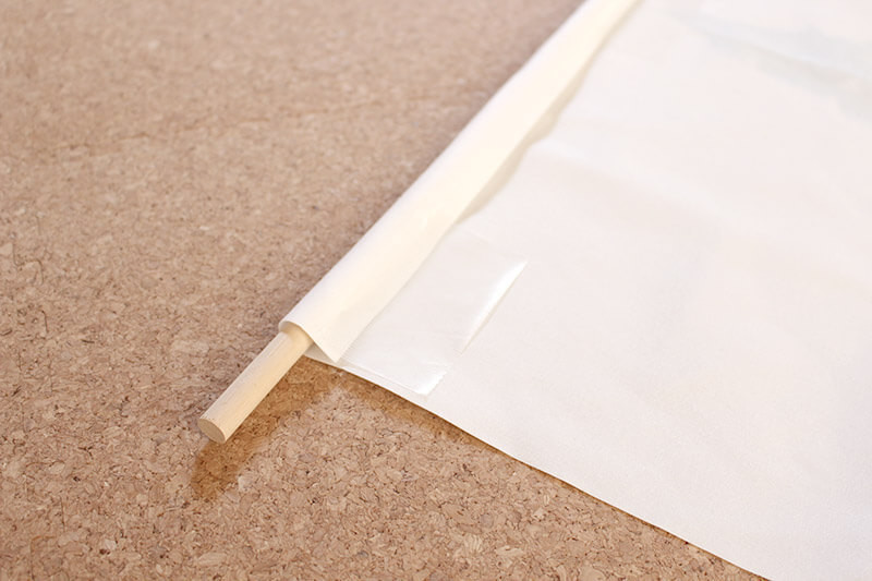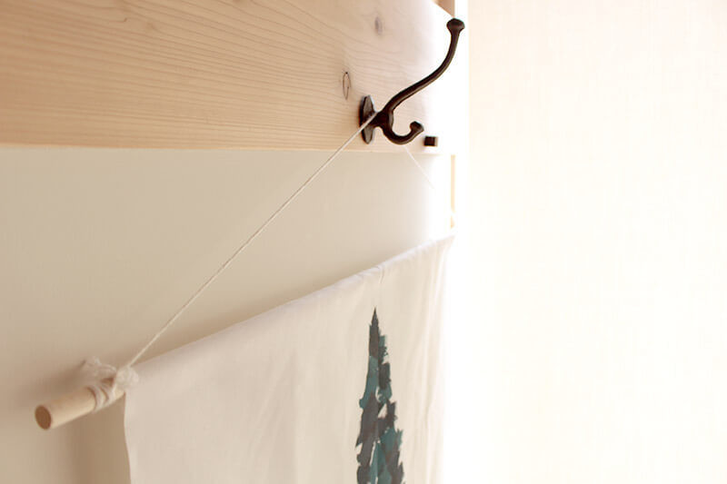 タペストリーの上部を棒にクルンと巻きつけ、ヒモで吊り下げます。