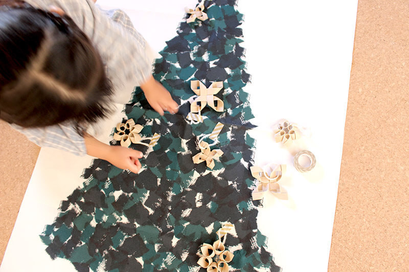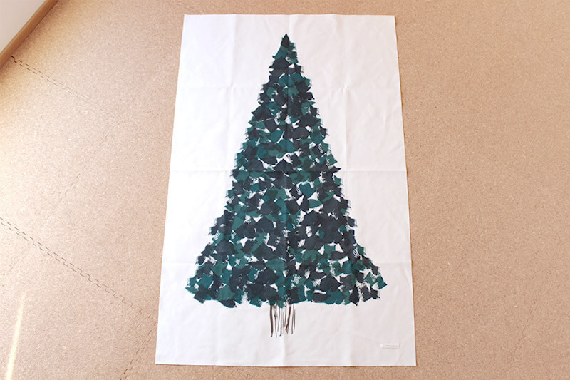 素朴な手書きタッチのモミの木は、インターネットショップ「アンジェ」のオリジナル柄。北欧ライクな温かみのある仕上がりです。このツリーを娘と一緒に飾り付けていきます。