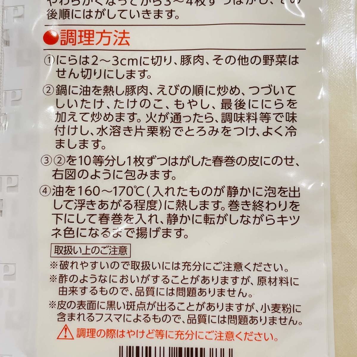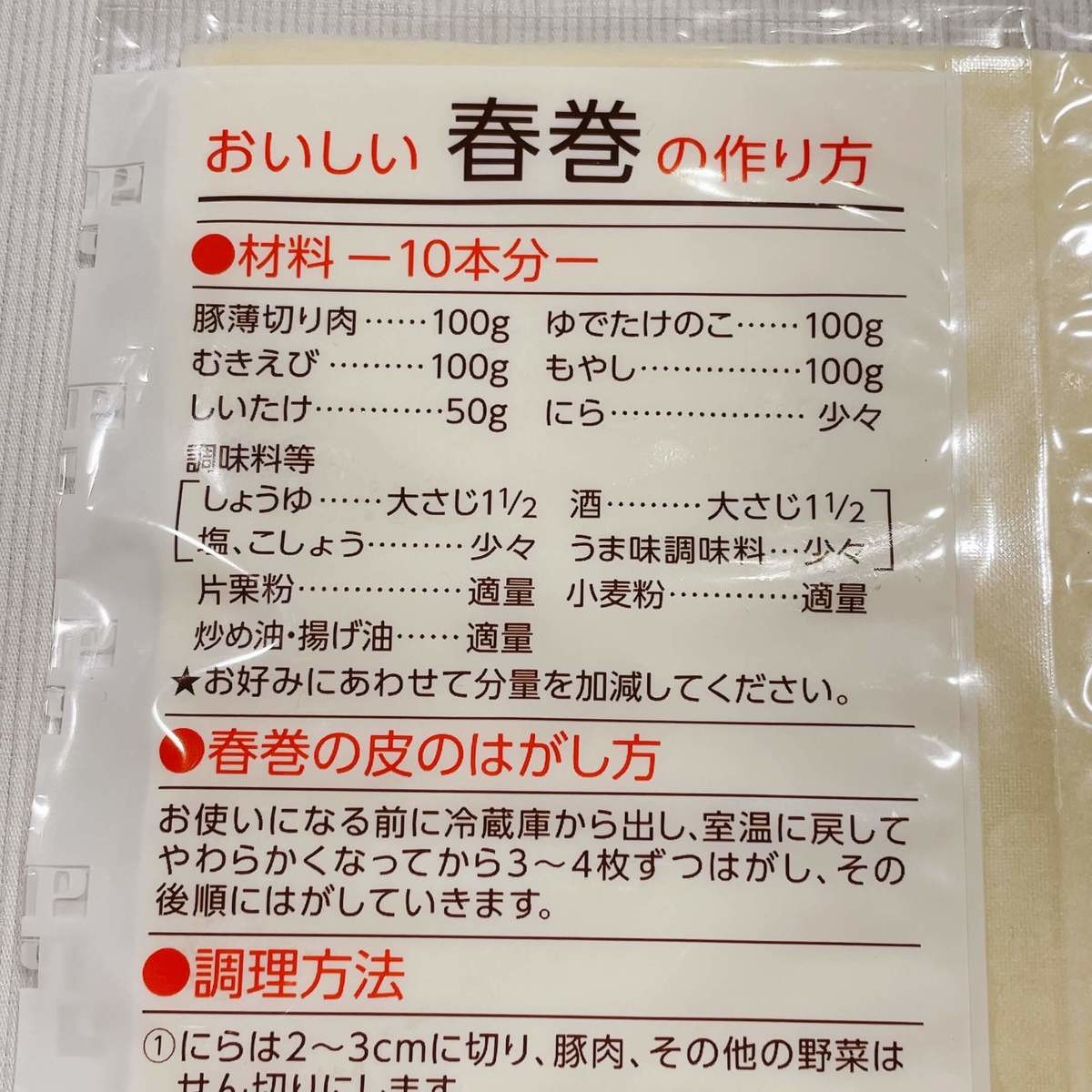 業務スーパーで販売されている春巻きの皮はパッケージの裏に春巻きの材料から皮のはがし方までくわしく書かれています。