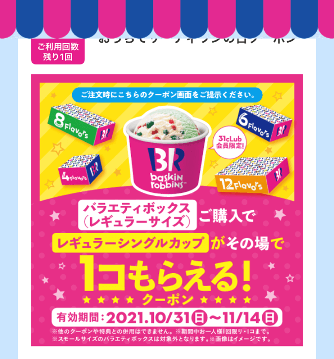 ですが、「おうちでサーティワンの日」の特典は1個購入につき、レギュラーシングルカップ1個無料です。