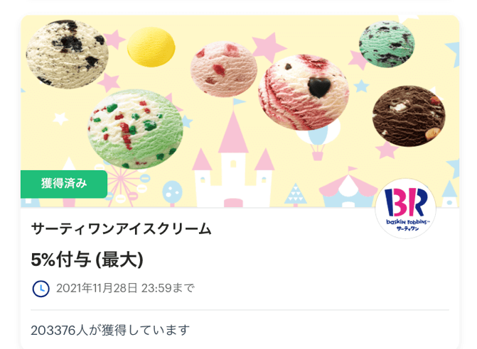キャンペーンのひとつとして、サーティワンで使える「5%還元クーポン」を配布しています。