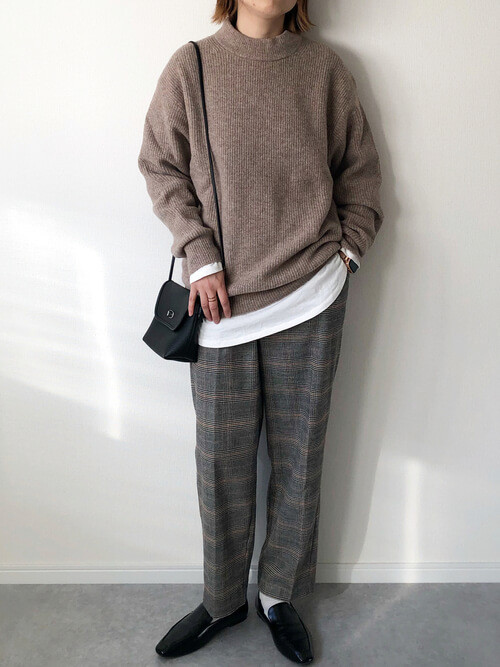 ゆとりのあるモックネックから、ストライプなど色柄シャツをのぞかせるとまた違った雰囲気に。