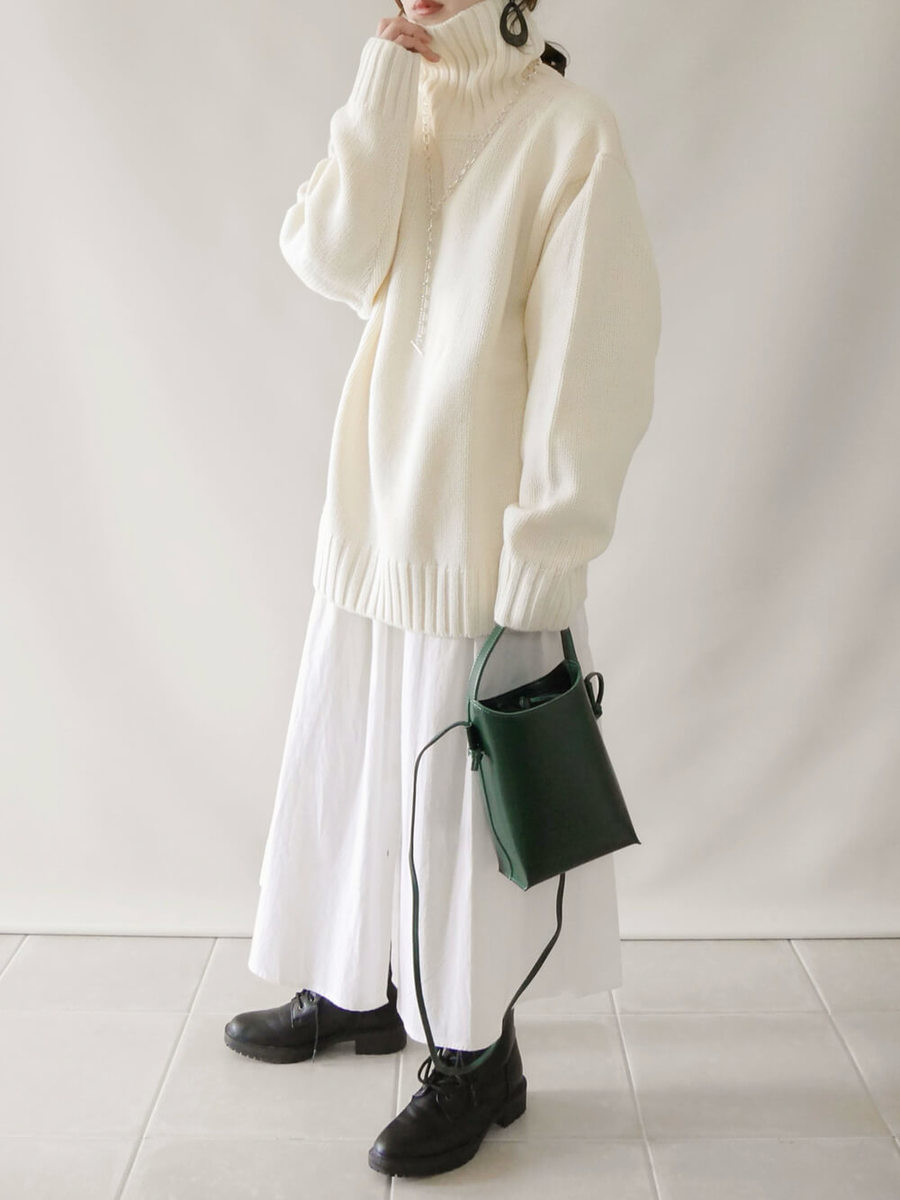 バンドカラーシャツワンピに、オフホワイトのタートニットを重ねています。