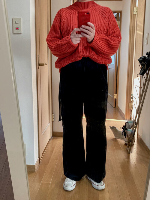 鮮烈なオレンジのチャンキーニットは、冬コーデの主役として取り入れたいカラー。少し派手ではありますが、アウターを羽織ることが多くなる季節のアクセントとして大活躍します。