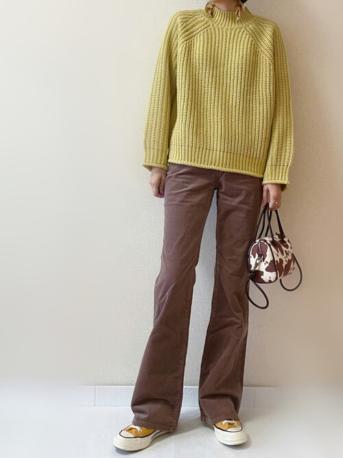秋冬らしい深いトーンでカジュアルな普段のファッションになじむ、イエローチャンキーニット。
