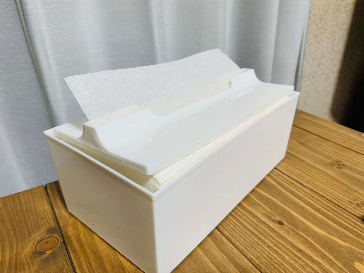 フタが少し浮いた状態なので最初は気になりましたが、最後の1枚までしっかり使えて大満足の使い心地です。試しに箱なしのティッシュペーパーも入れてみましたが、問題なく使用できました。