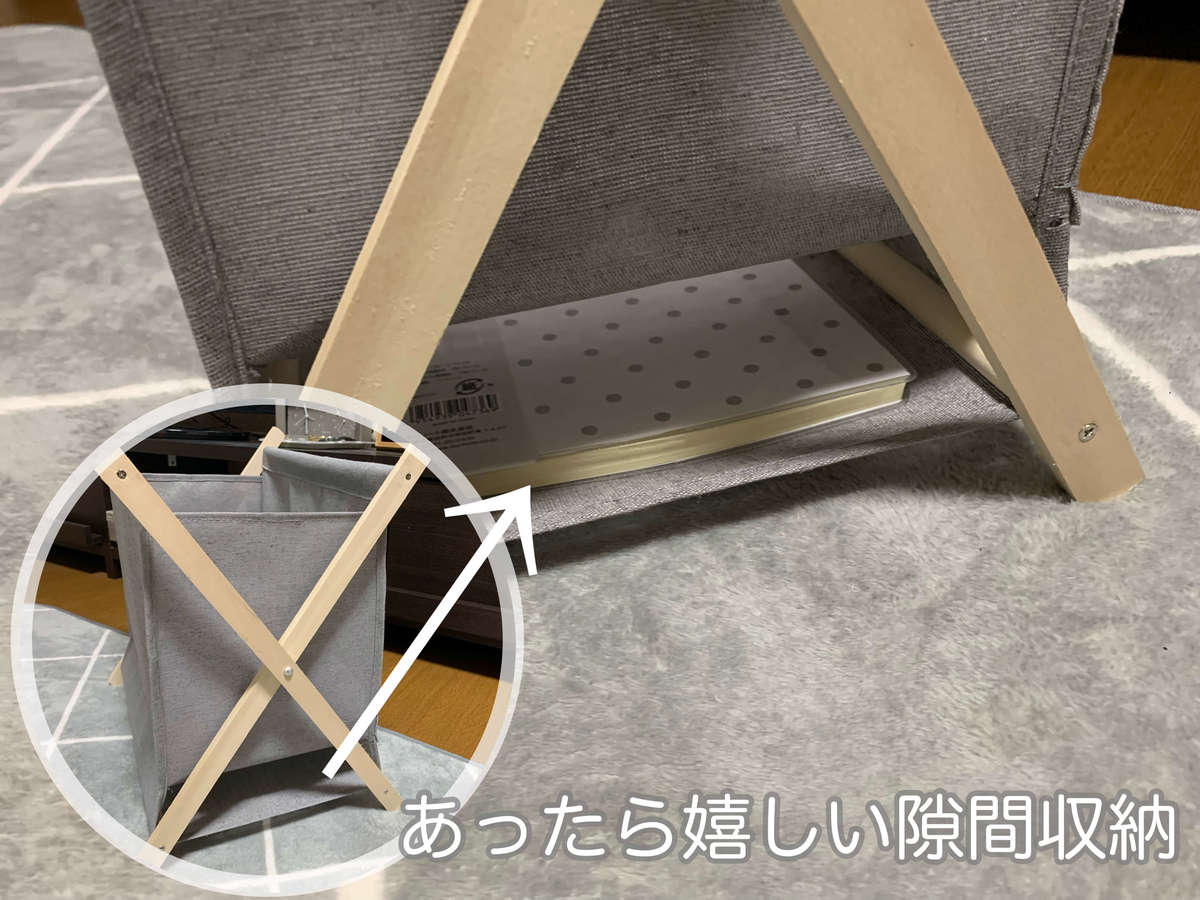 このマガジンラックは、正面に3つのポケットと写真のようにサイド下に隠れた収納スペースがあるので、こまごました小物類や新聞、手帳などもスッキリ片付けることができますよ。