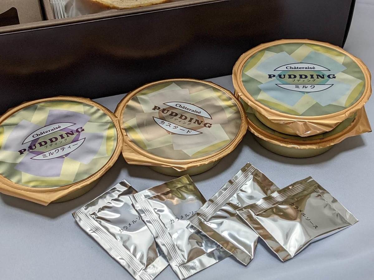 「ミルクプディング」2個、「ミルクティープディング」1個、「カスタードプディング」1個とすこやかの樹2個入ったギフトBOX。