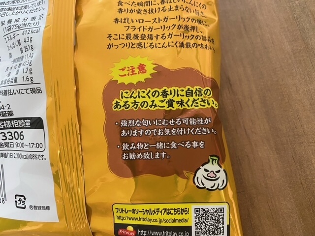 バターパウダーの味がはじめに口の中に広がりにんにく感はあまり感じません。でも、噛めば噛むほど口の中がにんにくに!!