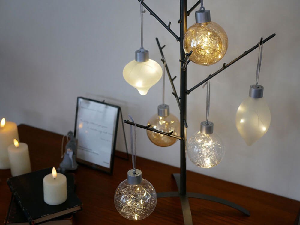 「LEDライトオーナメント(3種類)」は上部のつまみをひねるだけの電池式だから、ツリーへの飾り付けにぴったり。ボタン電池(LR44)3個使用で約200時間の使用が可能です。