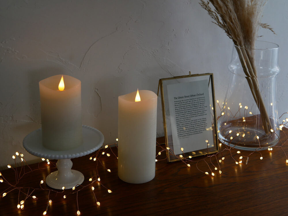 キャンドルは本物のようにLEDの炎がゆらめき、電池式なので気軽で安全に楽しめるから◎。