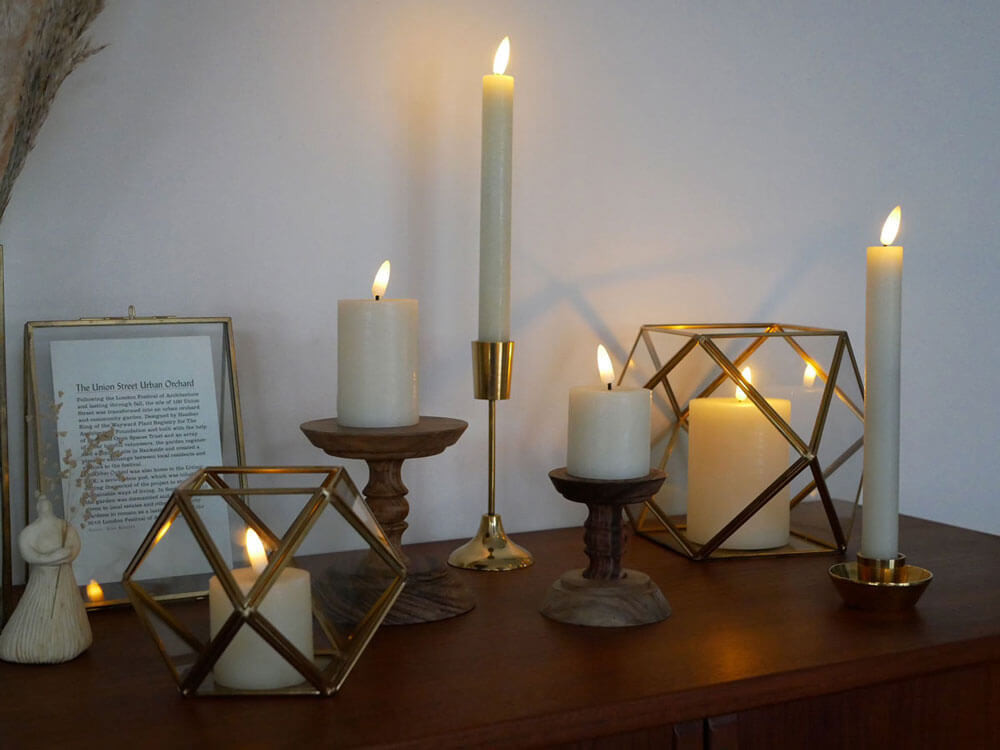キャンドルは安全な電池式LED、スタンドはシーシャムウッドや真鍮製。ヴィンテージ感漂う空間で大人の時間を堪能できますね。
