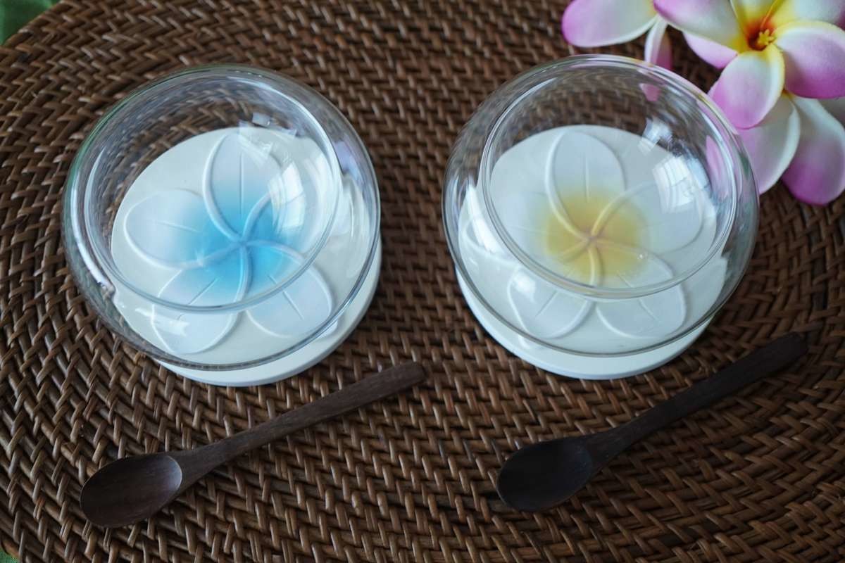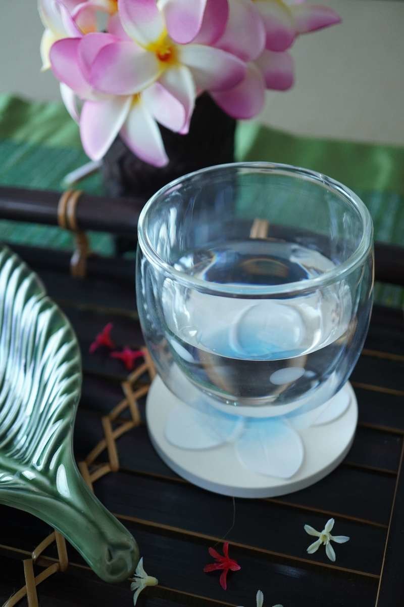 グラスを置くとこのようになり、完全にプルメリアが隠れてしまうことはありません。