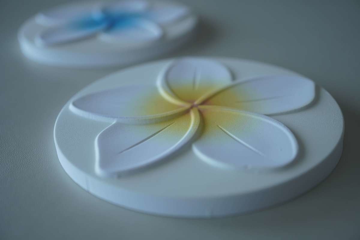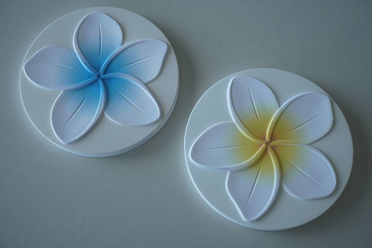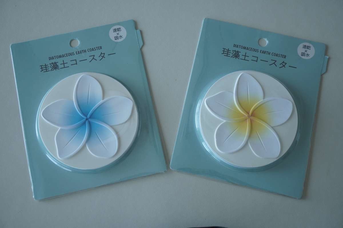 珪藻土のコースターやトレーは様々な100均で見かけますがプルメリア柄のコースターは初めて見かけました。