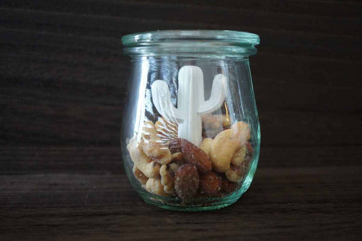保存容器にミックスナッツを入れて乾燥剤代わりとしても使えますが、透明な花瓶などに粉砕ガラスを入れてこちらのサボテンや100均で販売している小さな動物の置物などを飾ればインテリアとしても使えます。