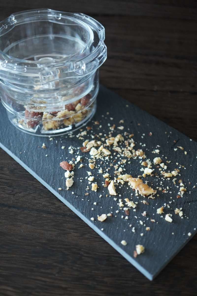 実際に使用してみると力を入れなくてもこのようにナッツを細かく砕くことができました。