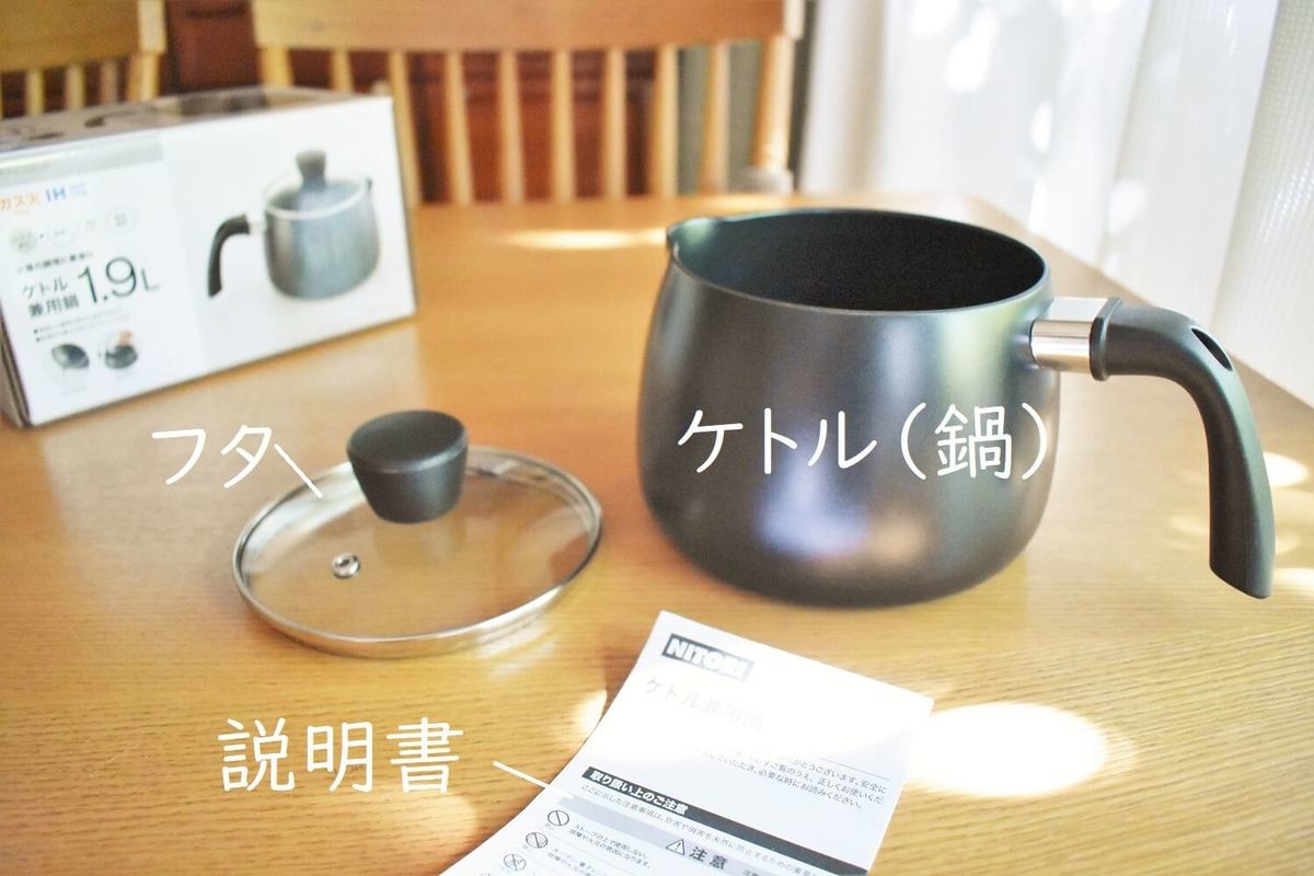 箱の中に入っているものは3つ。ケトル兼用鍋本体と、強化ガラスのフタ。そして説明書です。その大きさは、