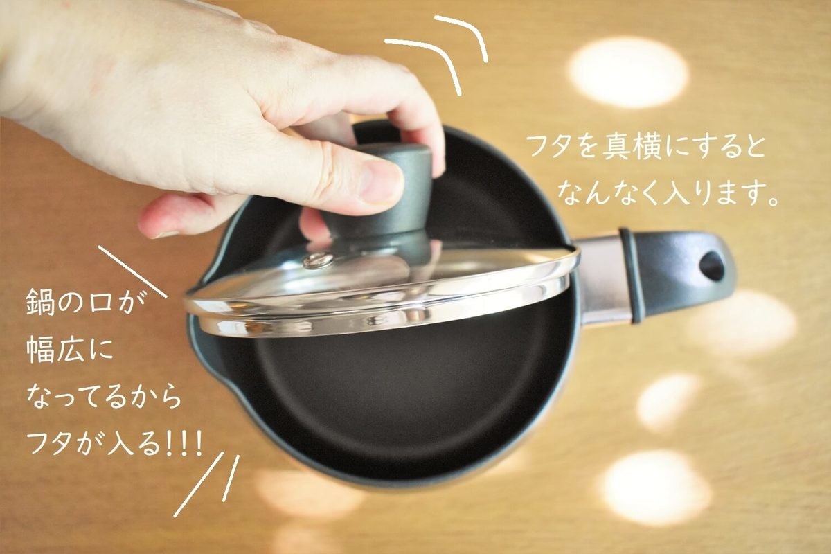 もう一つ、驚いたのはフタがこの本体の中に入ってしまうこと。 鍋の口の部分が注ぎやすいように他より幅1cm広くなっており、フタを真横(縦)にすればスルッと入ります。