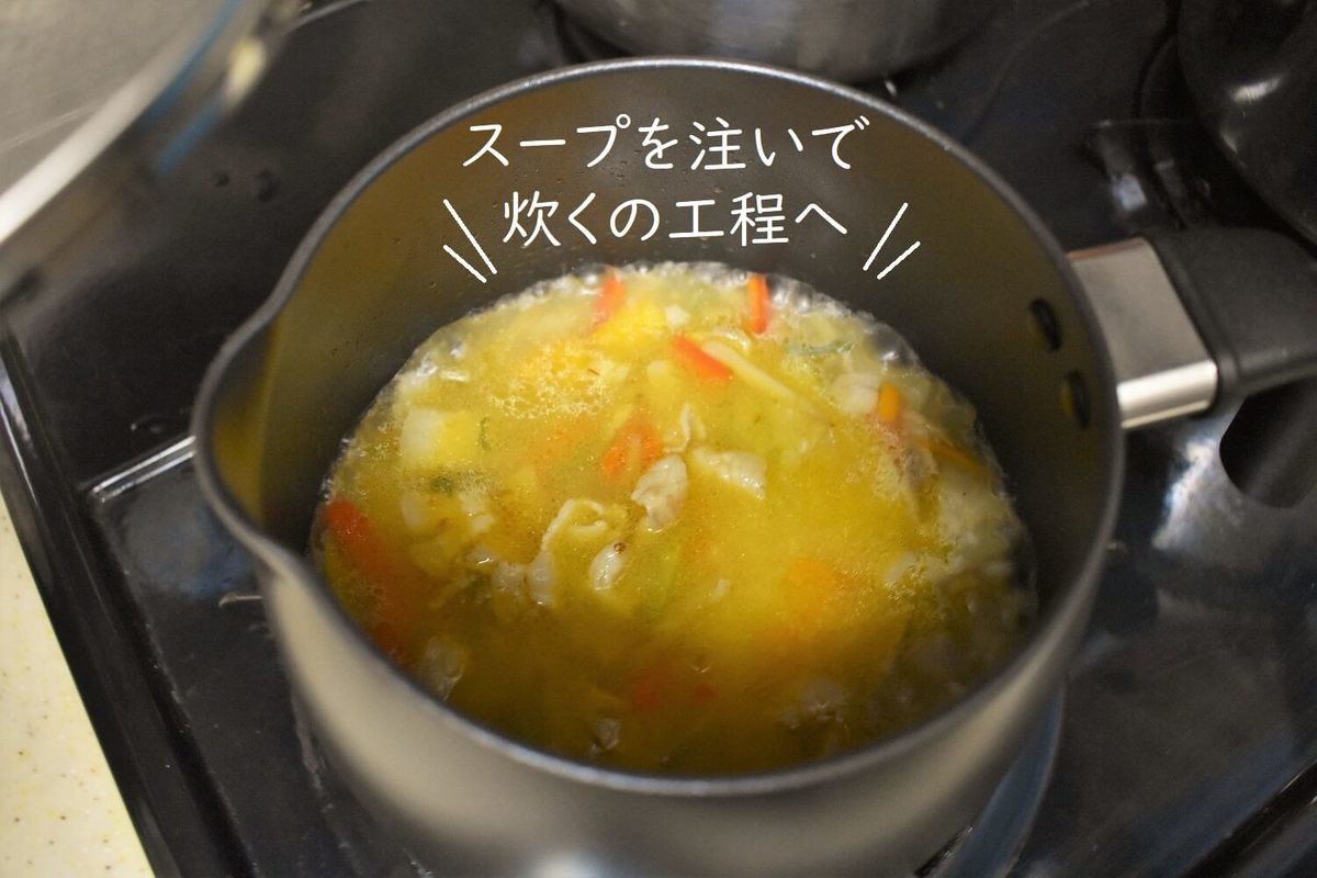 お米が透明になってきたら、そこにあらかじめ用意していた適量のスープを注いで、強火にし、沸騰させます。
