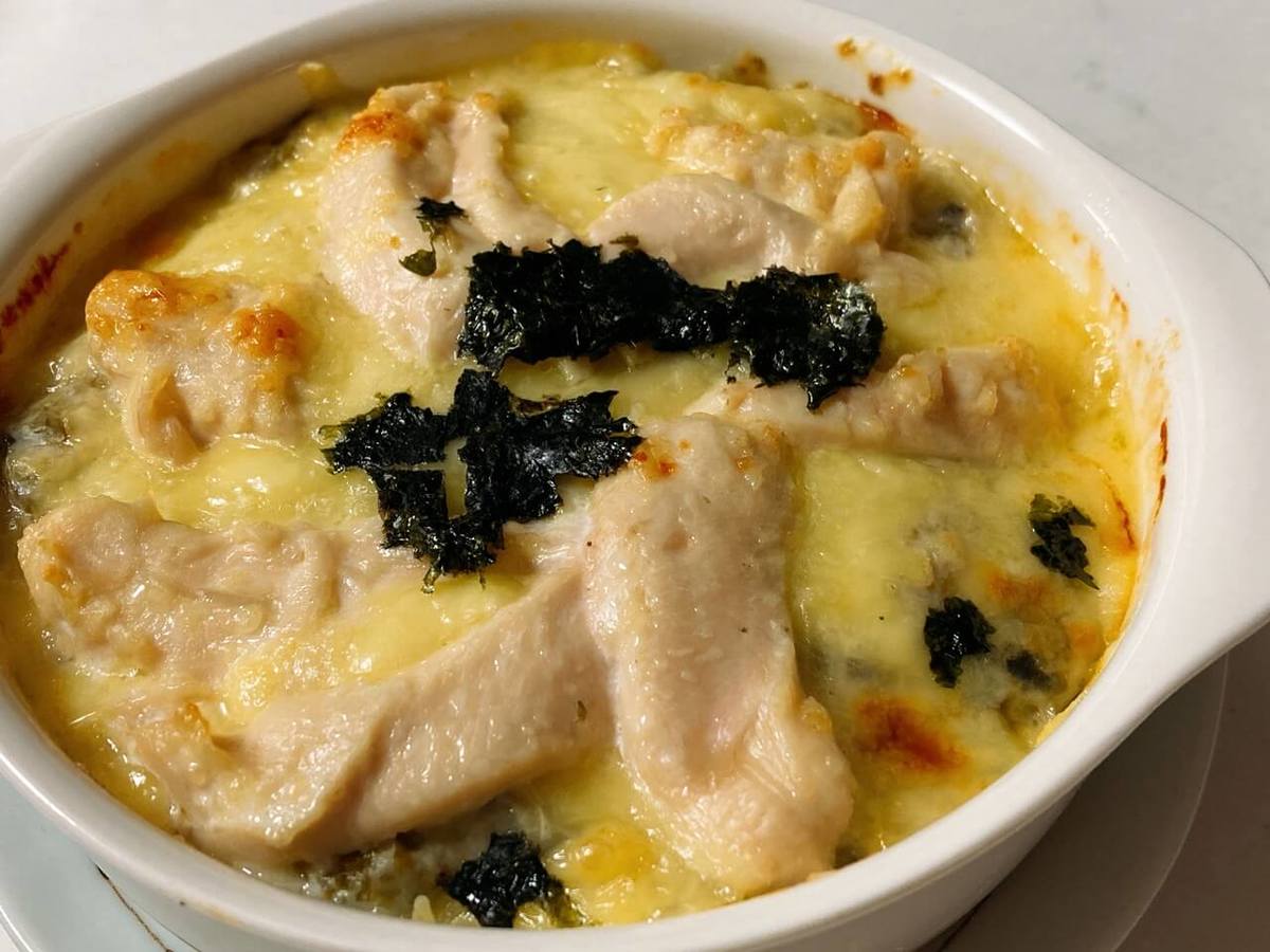 ④ ②で用意したご飯に①で作ったホワイトソース、ピザ用チーズ(適量)、③のささみをのせ、トースター(200℃)で約15分焼く