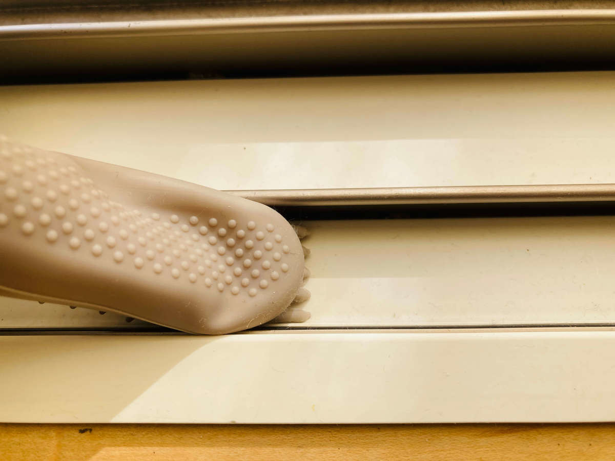 指先にブラシがあると、細かいところがお掃除できます。試しに窓のサッシの汚れにあててみると...見事にピッタリ!