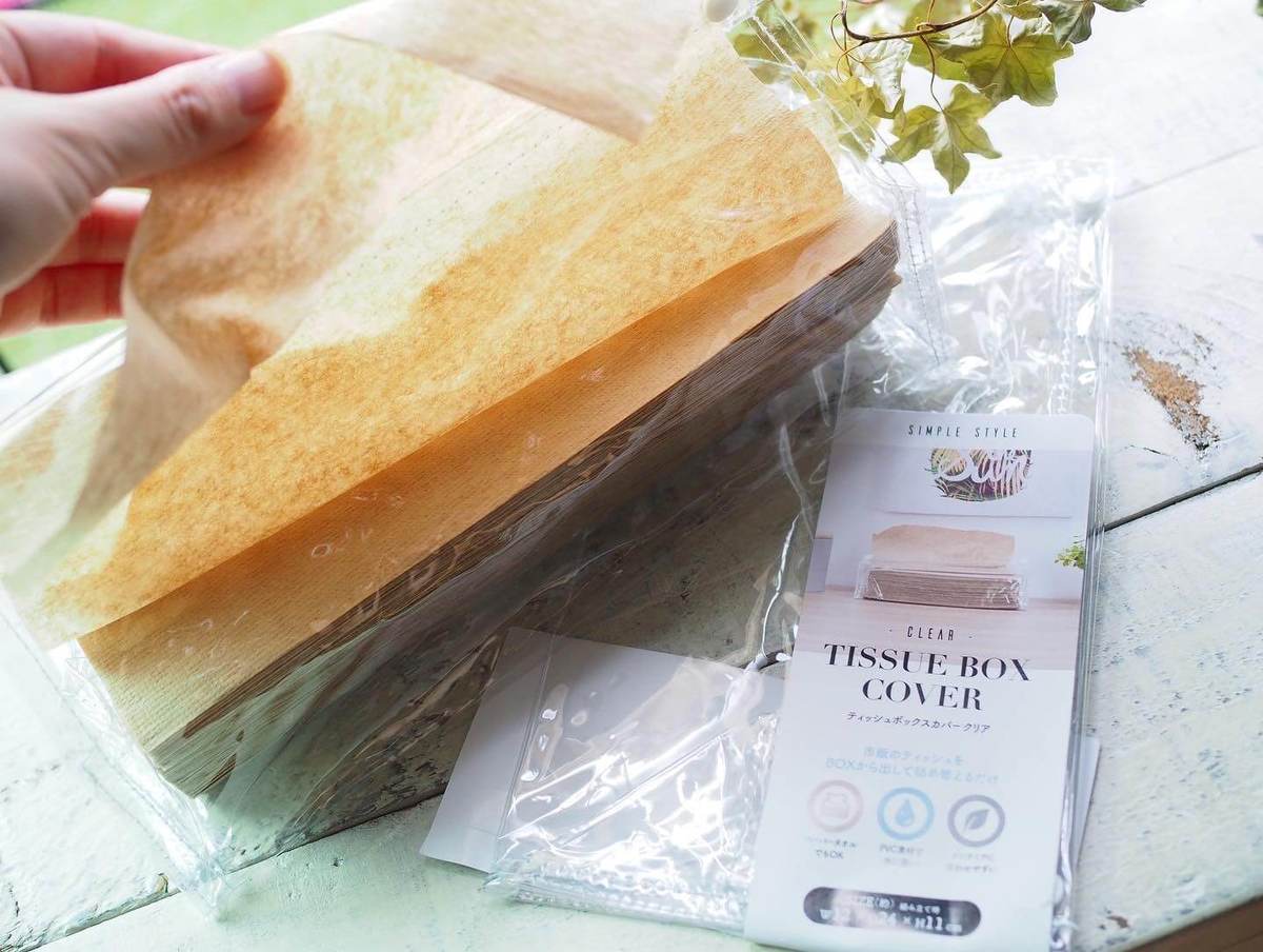 シンプルなクリア素材のティッシュボックスカバーですが、今まで100円ショップには無かったようなペーパタオルの収納にも使えるサイズなんです。
