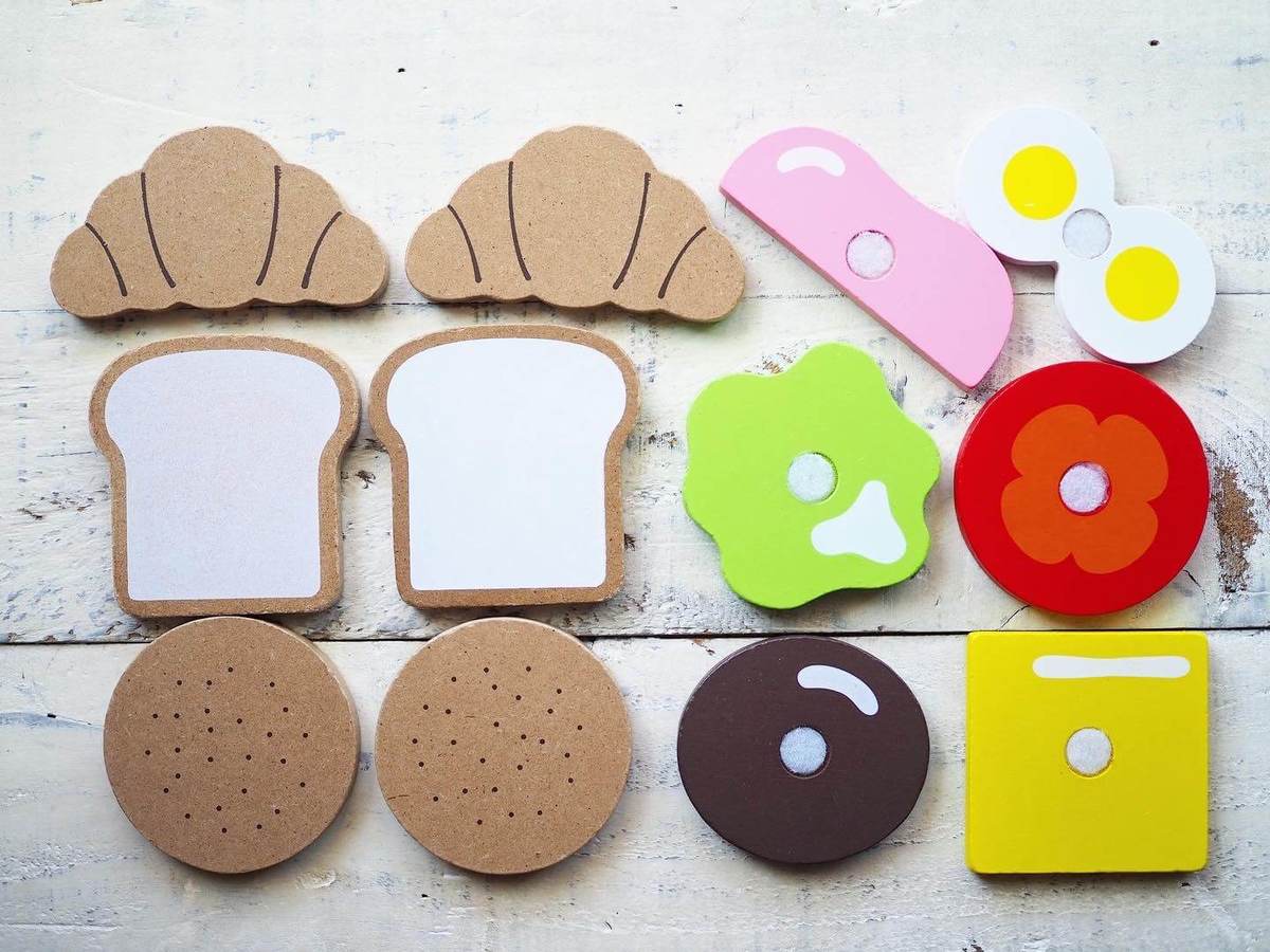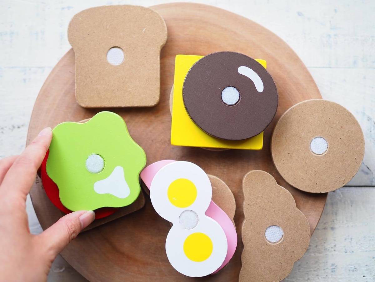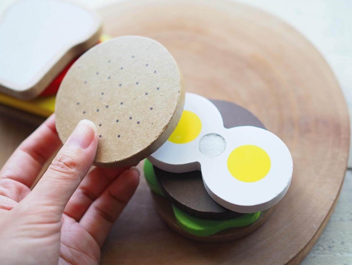 具材は面ファスナーでくっつきます。色々なサンドイッチやハンバーガーを作って、盛り上がること間違いなしです。