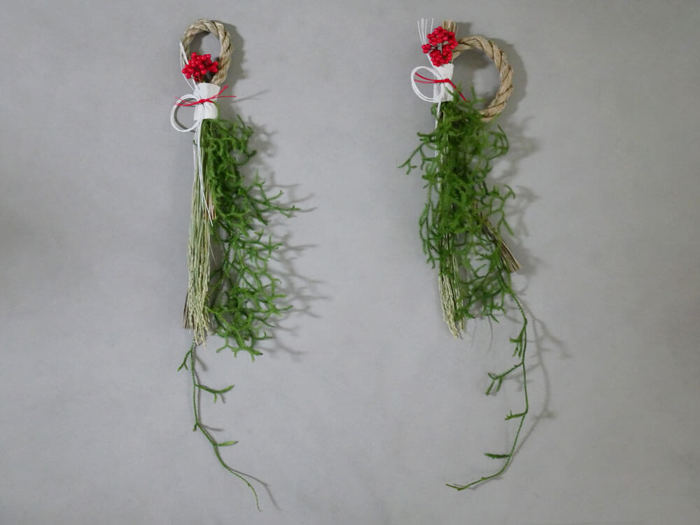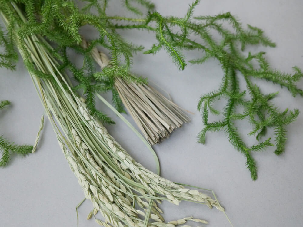 「ヒカゲカズラしめ飾り」は全体的にはシンプルな出で立ちながら、鮮やかな緑色でナチュラルに華々しい、そんなハイセンスさに見惚れてしまいます。