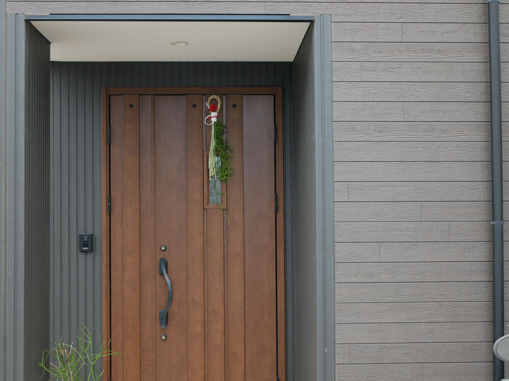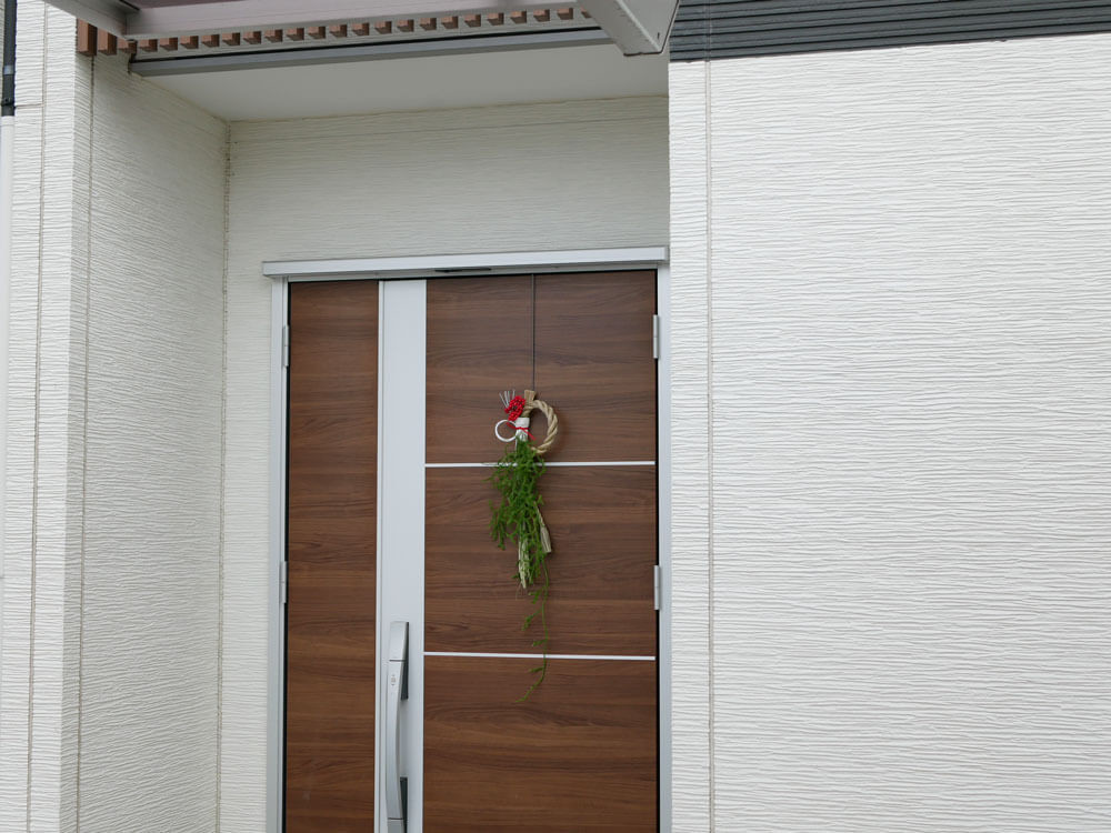縦のラインが玄関ドアをスタイリッシュに、お正月らしい3色にまとめられた上品なしめ飾りは大人らしい華やぎさを魅せてくれますね。
